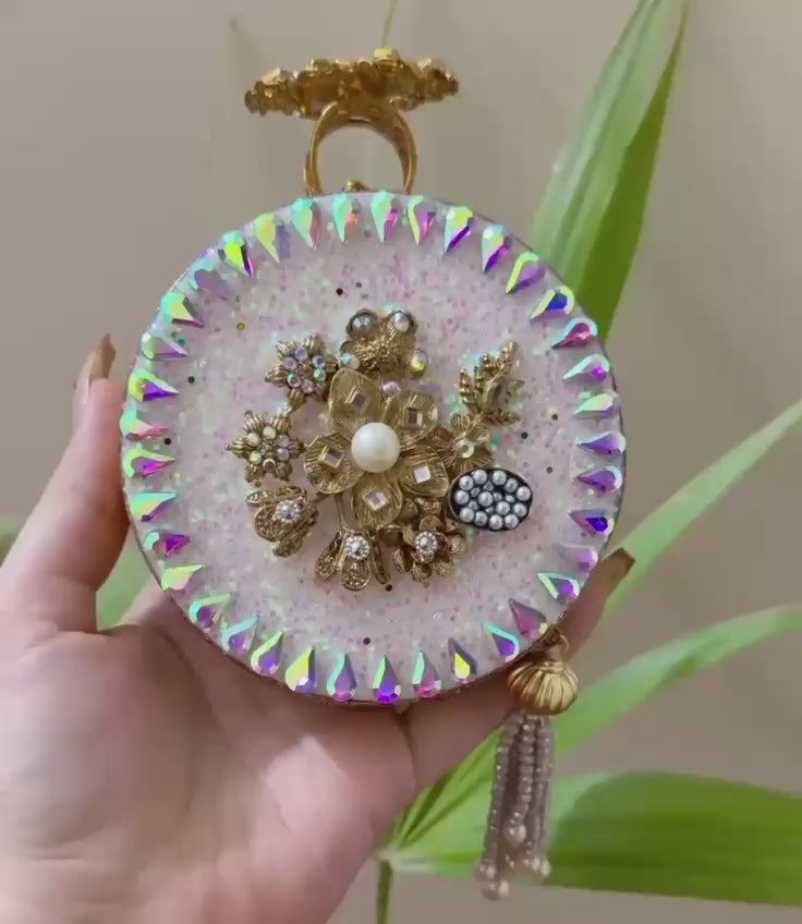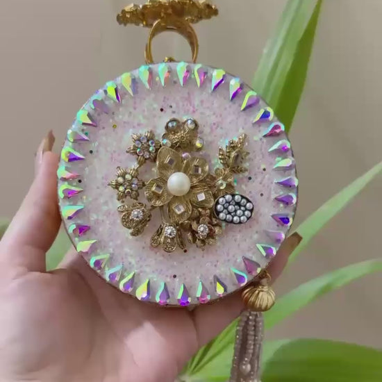 Avoid exposure to water, perfumes, or harsh chemicals to protect the crystals and floral design.
