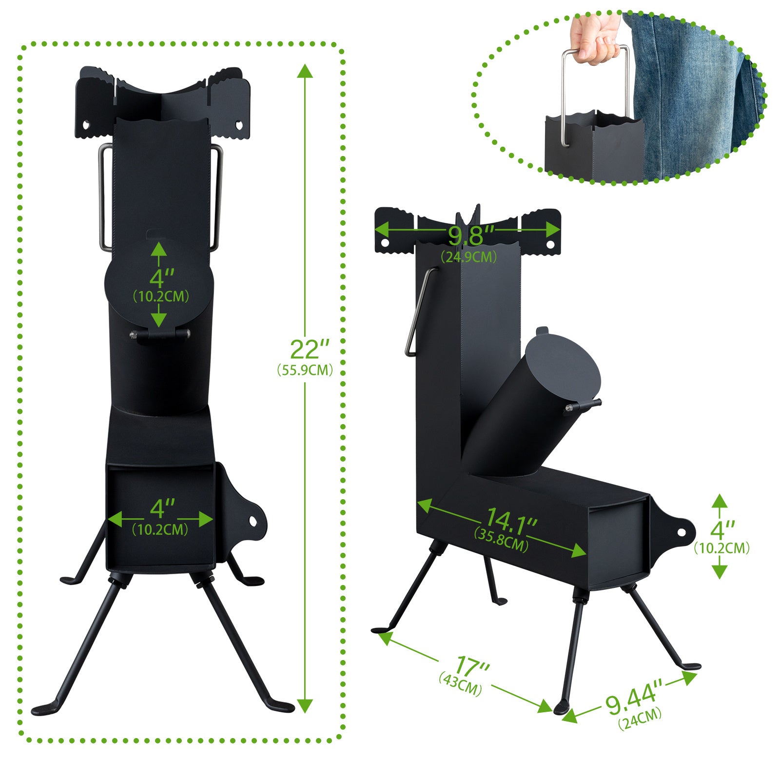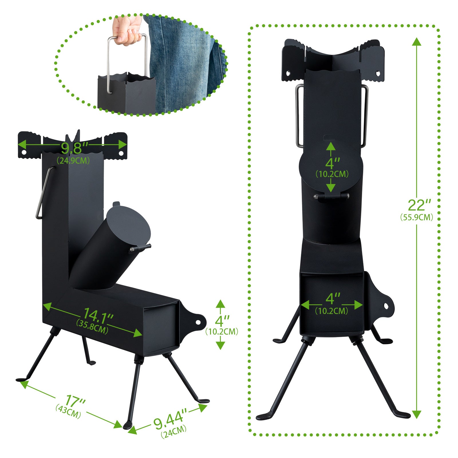 Portable design: Rocket stove is welded from high-quality low-carbon steel. The integrated camping rocket stove is durable and easy to carry. This tiny stove is convenient for carrying and transportation. The feet of the rocket stove for cooking are detachable, adjustable, so it can stand on uneven ground.It can meet the outdoor needs of different scenarios. Enough high stove legs protects lawns from heat damages.